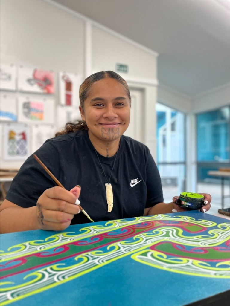 EIT Year 13 Scholarship winner Makarena Te Moanapapaku-Stephens is enjoying the first year of a Bachelor of Māori Visual Arts (Toi o Ngā Rangi) at Toihoukura – School of Māori Art and Design on EIT’s Tairāwhiti Campus.